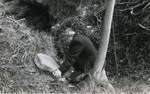 Suzanne de Saint-Mathurin découvrant une dalle gravée lors de sa première visite sur le site