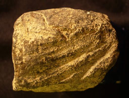 Des stries nettes sur l’une des faces du bloc indiquent qu’il a été gratté à l’aide d’un outil en vue de produire de la poudre de manganèse. Une autre face paraît avoir été raclée, mais la présence importante de sédiment empêche la bonne lecture des stigmates. Une face plane paraît avoir été frottée sur une surface dure, mais du sédiment gênant la lecture des stigmates est également présent. Quelques points de matières colorantes rouges sont à signaler.